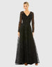 Black Crystal Embellished Long Sleeve V Neck Gown