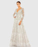This elegant A-line floral gown features a hand-embroidered overlay, sheer unlined sleeves, and a flattering V-neck faux wrap bodice. Allover heat-set jeweled embellishments add glamour, making it perfect for any special occasion.