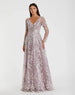 This elegant A-line floral gown features a hand-embroidered overlay, sheer unlined sleeves, and a flattering V-neck faux wrap bodice. Allover heat-set jeweled embellishments add glamour, making it perfect for any special occasion.