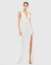 Floor-length sequined gown with a plunging v-neckline, wrap waist, and a thigh-high slit.