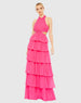 Pink Tiered Ruffle Pleated High Neck Gown with Cut Outs