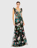 Black Embroidered Floral Plunge Neck Trumpet Gown