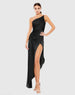 Glamorous one-shoulder draped satin dress with a a hi-low hem and daring slit.
