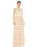 Indulge in elegance with our Embroidered Long Sleeve Ruffled Tiered Gown. This exquisite dress features long sleeves and a tiered skirt, adorned with delicate embroidery, creating a stunning and sophisticated look. It is sure to turn heads and leave a lasting impression.