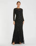 Long sleeve evening gown with a high bead-accented neckline, fitted bodice, illusion yoke and sleeves, and a floor-length mermaid skirt with a sweeping hem. The mesh overlay is adorned with beads and sequins placed in an abstract pattern. A hand-beaded belt accents the natural waist.