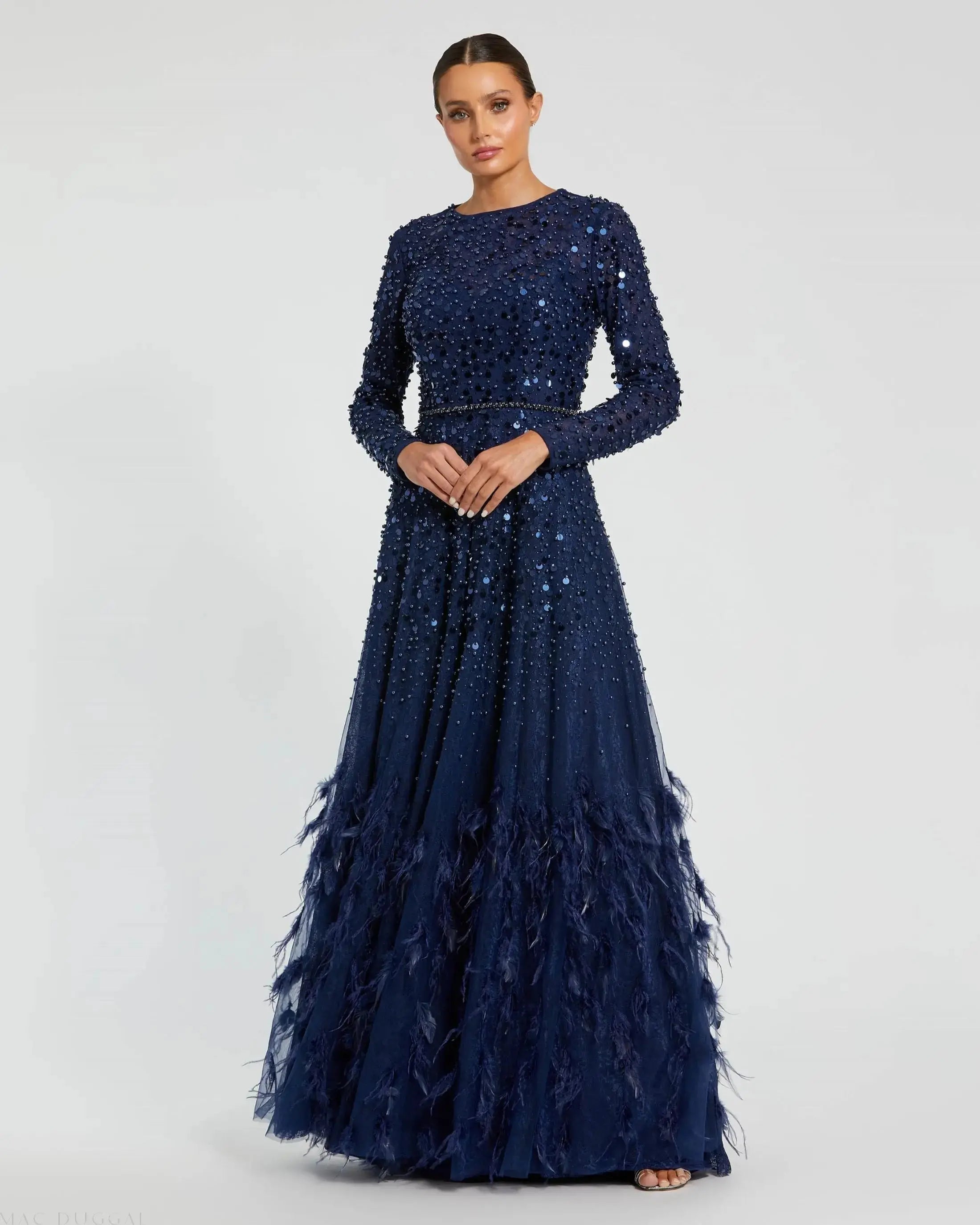 This exquisite gown features long sleeves and embellished fabric, creating a stunning and elegant look. The feather skirt detail adds a touch of luxury and sophistication, making it the perfect choice for any formal occasion.