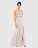 This flowy gown boasts an embellished cap sleeve bodice and flowing chiffon fabric. The thigh high slit adds a touch of elegance, making it a perfect choice for any special occasion. The embellished bodice adds a touch of glamour, guaranteeing you'll stand out from the crowd.