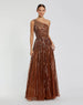 This stunning one-shoulder A-line gown is embellished with cascading diagonal rows of sequins and beads throughout the mesh overlay. The focal point of this gown is the beautiful bead work that lays at the top of the bodice. This gown also features a small sweeping train, and a dainty hand-beaded belt sits at the natural waist.
