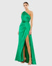 This one-shoulder satin gown with pleats, draping, and a daring slit is perfect for a white-tie or black-tie event, featuring an elegant asymmetrical shape and sweep train finish.