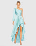 One-shoulder full-length satin dress with a single long sleeve, pleated bodice, and a pleated skirt with a hi-low hemline.