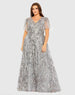 This High Neck Flutter Sleeve Embellished A-Line Gown features a v neckline, sheer flutter sleeves, and embroidered fabric. The elegant design is perfect for formal occasions and evening events.