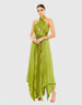 Make a statement at any event in this pleated halter neck gown. Sure to turn heads, this gorgeous satin gown features accordion pleats, a crisscross halter neckline, and a layered handkerchief hem.